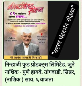 सिन्नरच्या मातृभूमीत जन्मलेल्या ध्येयनिष्ठ, कष्टाळू आणि अतिप्रामाणिक व्यक्तीमत्व असलेले लाडके दादा म्हणजे सन्माननिय श्री. आनंदा आबाजी निऱ्हाळी यांचा शनिवार दि. ०७ ऑक्टोबर २०२३ रोजी “सहस्र चंद्रदर्शन सोहळा” आयोजित करण्यात आला आहे.