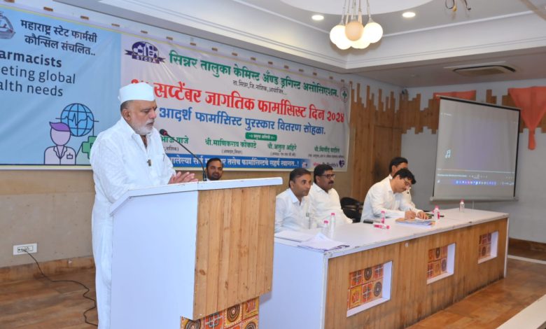 सिन्नर तालुका केमिस्ट अँड ड्रगिस्ट असोसिएशन तसेच डॉ. रेड्डीज लॅबोरेटरी फार्मा कंपनी यांच्या संयुक्त विद्यमाने जागतिक फार्मासिस्ट दिनाच्या (२५ सप्टेंबर) निमित्ताने आयोजित केलेल्या आदर्श फार्मासिस्ट पुरस्कार वितरण सोहळ्यात ते प्रमुख पाहुणे म्हणून बोलत होते. कार्यक्रमाची सुरुवात दीप प्रज्वलन व धन्वंतरी पूजनाने झाली. व्यासपीठावर अन्न व औषध प्रशासन नाशिकचे सहआयुक्त मिलिंद पाटील, राज्य फार्मसी कौन्सिलचे अध्यक्ष अतुल अहिरे, नाशिक जिल्हा केमिस्ट संघटनेचे अध्यक्ष सुदेश आहेर, सह सचिव सचिन वाळुंज, मा. जिल्हा परिषद सदस्या सीमंतिनी कोकाटे, रवींद्र पवार, सिन्नर केमिस्ट संघटनेचे अध्यक्ष संजय सांगळे आदी उपस्थित होते.